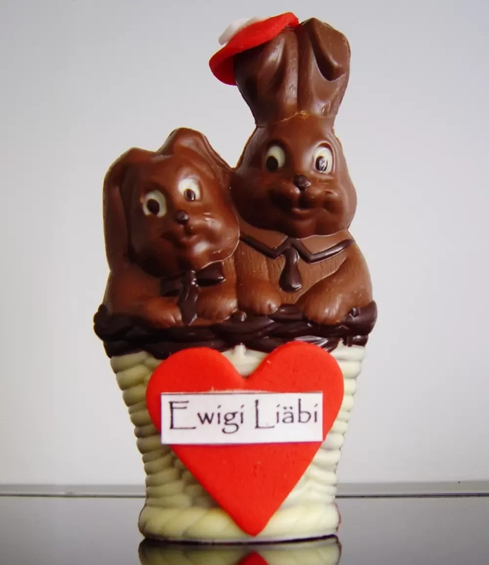 Immer wieder an Ostern gibt's irgendwo in einer Konditorei in der Schweiz eine Süssigkeit wie im Jahre 2008 das Beispiel des Schokoladen-Osterhasen.